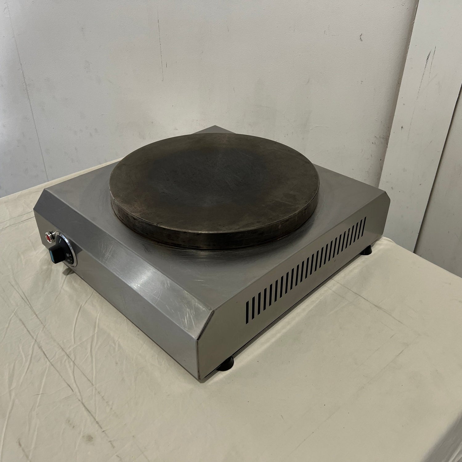 Crepe Plate. Features Cast iron plate, Plate surface size: 350mm diameter, Adjustable thermostat, Rubber feet, S/S Finish, Scratches & Dents, 10 Amp 1 Phase, 425mmW x 505mmD x 145mmH, 17KG