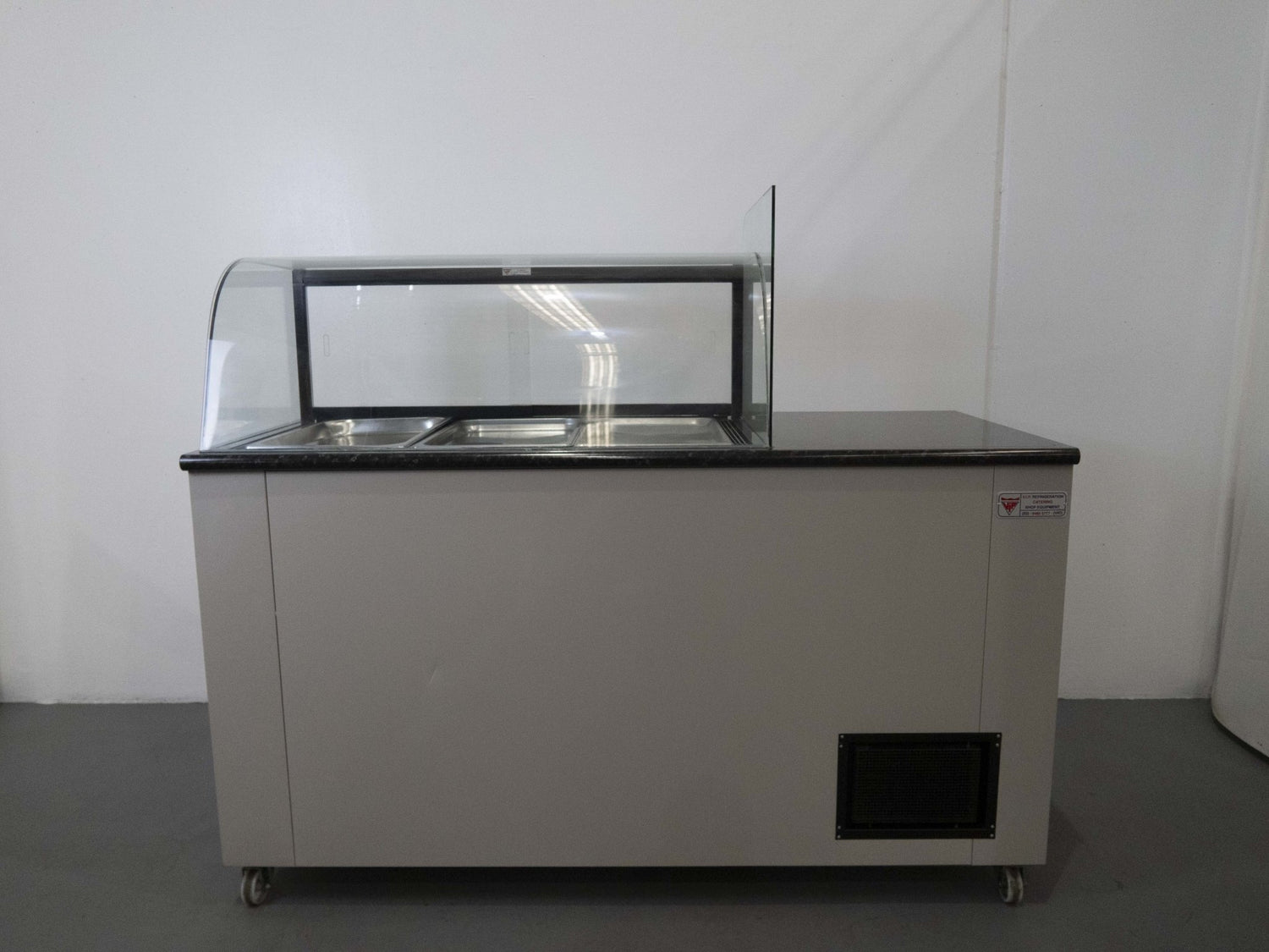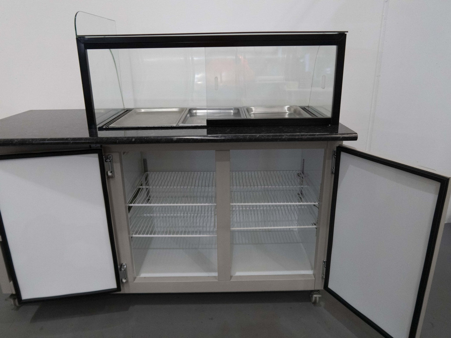 Cold Food Display. Features Flat and Curved glass canopy, 2 Solid Door Chiller, 2 x Shelves, Bench, On castors, Climate class normal, White, Scratches & Dents, Manual temp. controls, 1750mmW x 800mmD x 1500mmH, 190KG, 10 Amp 1 Phase