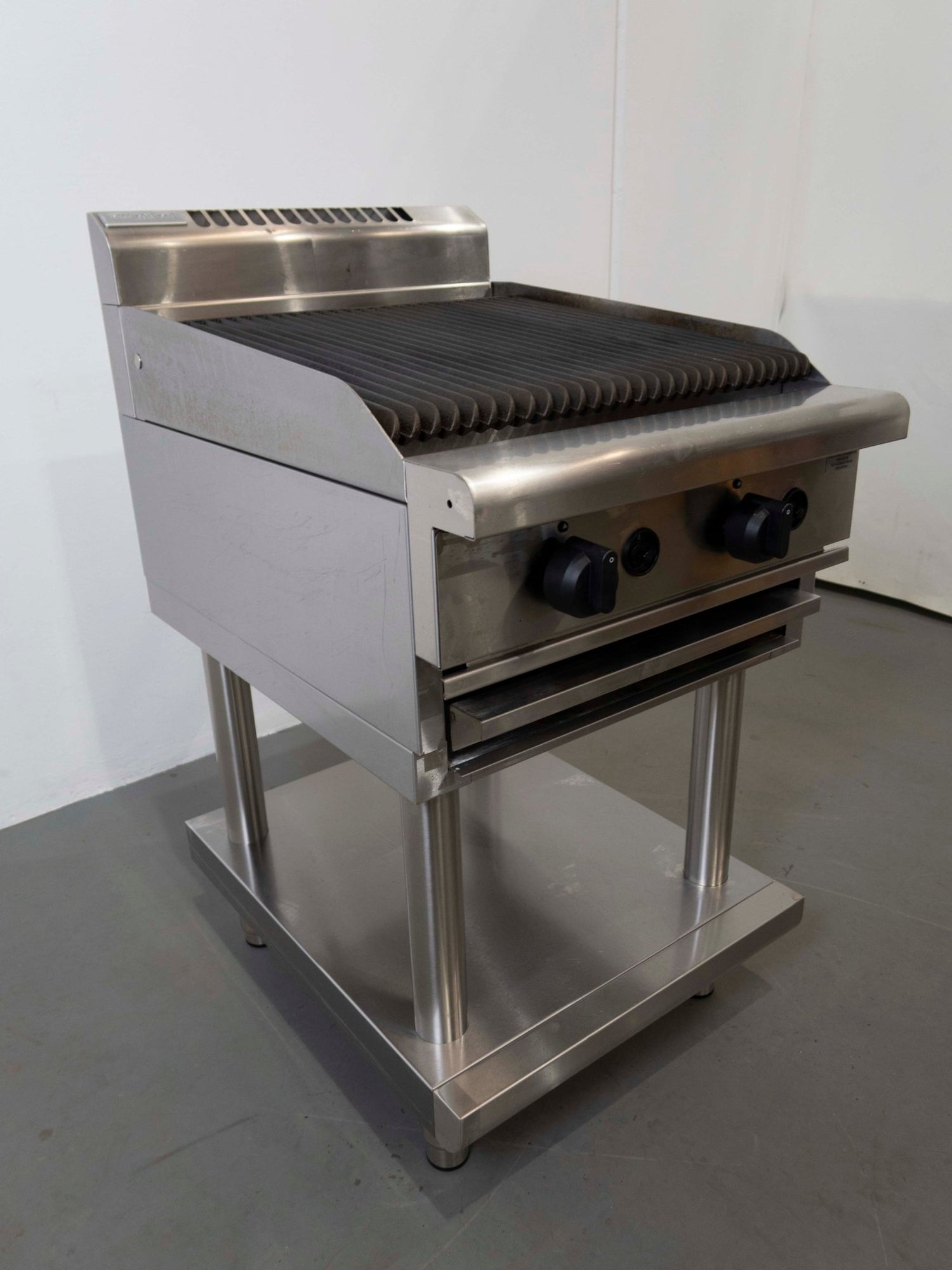 Char Grill. Features 2 Burner Char Grill, Drip tray, 4 Grill Plates, Adjustable feet, Flame fail valve, Inclined position to reduce flare and enhance grease run, Reversible heavy–duty top grates, S/S Finish, Scratches & Dents, 66Mj/hr, Heavy–duty construction, Natural Gas, 600mmW x 805mmD x 1110mmH, 130KG