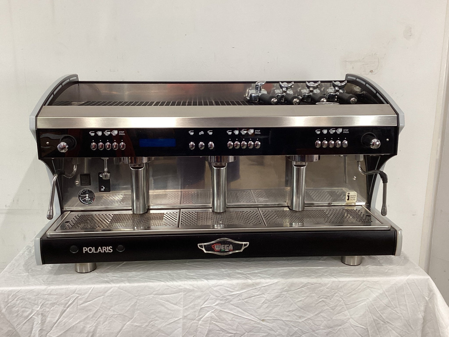 3 Group Coffee Machine. Features Tall Cup Capacity, Single 17L Boiler, Shot Timer, 2 Steam Wands, Hot Water Outlet, 1 Single & 3 Double Group Handles, Blind Filter Cap, Black & S/S Finish, Surface Scratches, 985mmW x 560mmD x 530mmH, 90KG, 25 Amp 1 Phase Hard Wired