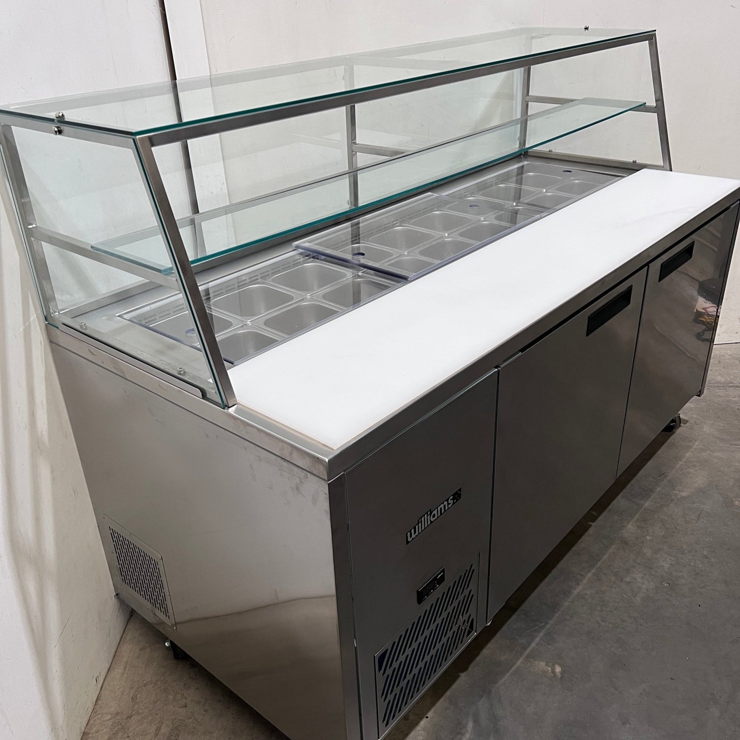 Sandwich Prep Fridge. Features Angled glass canopy, 2 Solid Door Chiller, 18 x 1/6 gn pans, 2 x Shelves, Bench with cutting board, On castors, Climate class sub tropical, S/S Finish, Scratches & Dents, Polycarbonate sliding lids over blown air well, Fully enclosed well under pans - prevents food dropping into cabinet, 1815mmW x 771mmD x 845mmH. 210KG. 10 Amp, 1 Phase.
