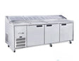 Pizza Prep Bench. Features 1070L capacity, 3 Solid door chiller, 13 x 1/3 pans, 4 Sliding lids, 3 Shelves, Bench with 2 wire racks, Castors, Climate class sub tropical, S/S finish, Brand new, 2480mmW x 830mmD x 1060mmH. 240KG. 10 amp, 1 phase.