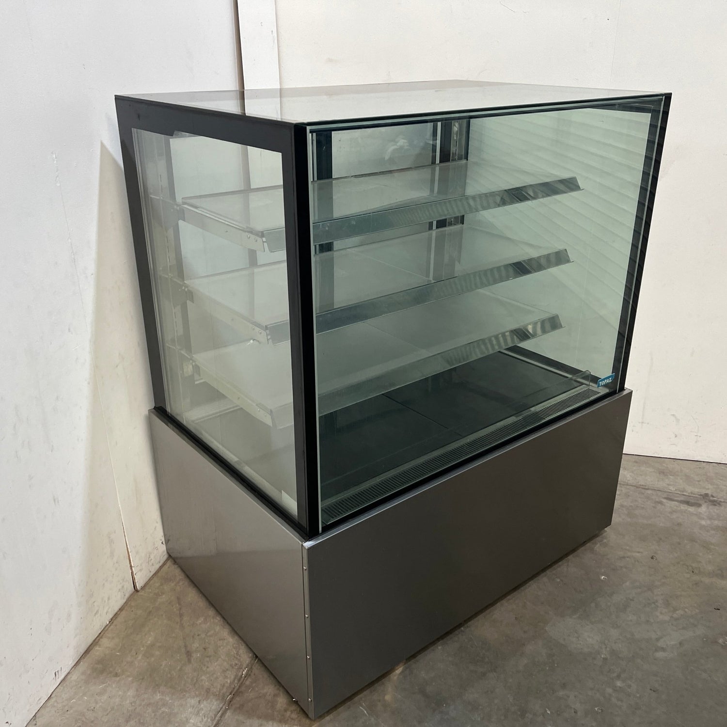 Square Glass Cake Display. Features Square Glass, 3 shelves plus base, Internal LED lighting, 2 x Rear sliding glass doors, Digital temp controls, On castors, Climate class tropical, S/S Finish, Scratches & Dents, 10 Amp 1 Phase, 1200mmW x 800mmD x 1375mmH, 220KG